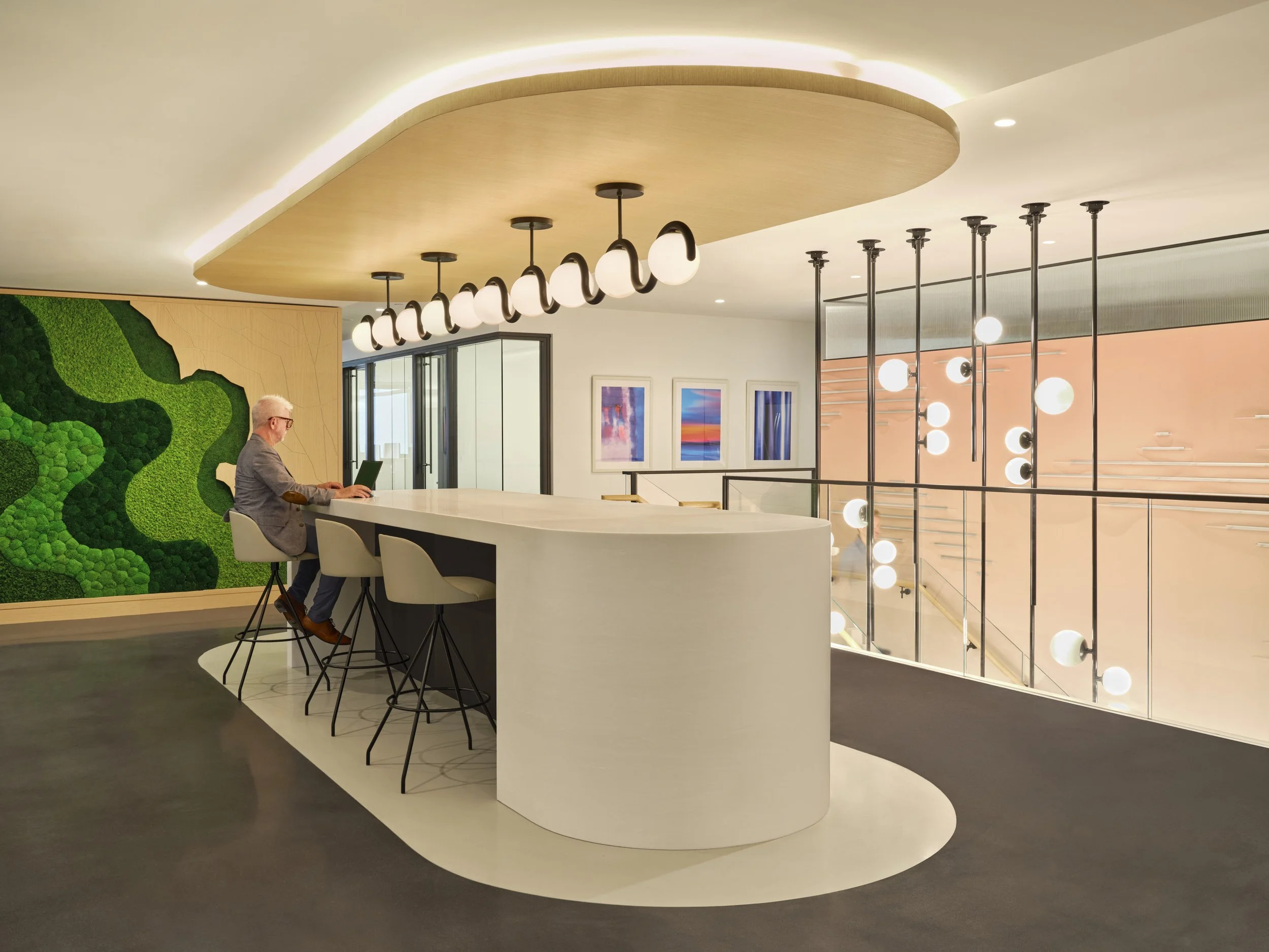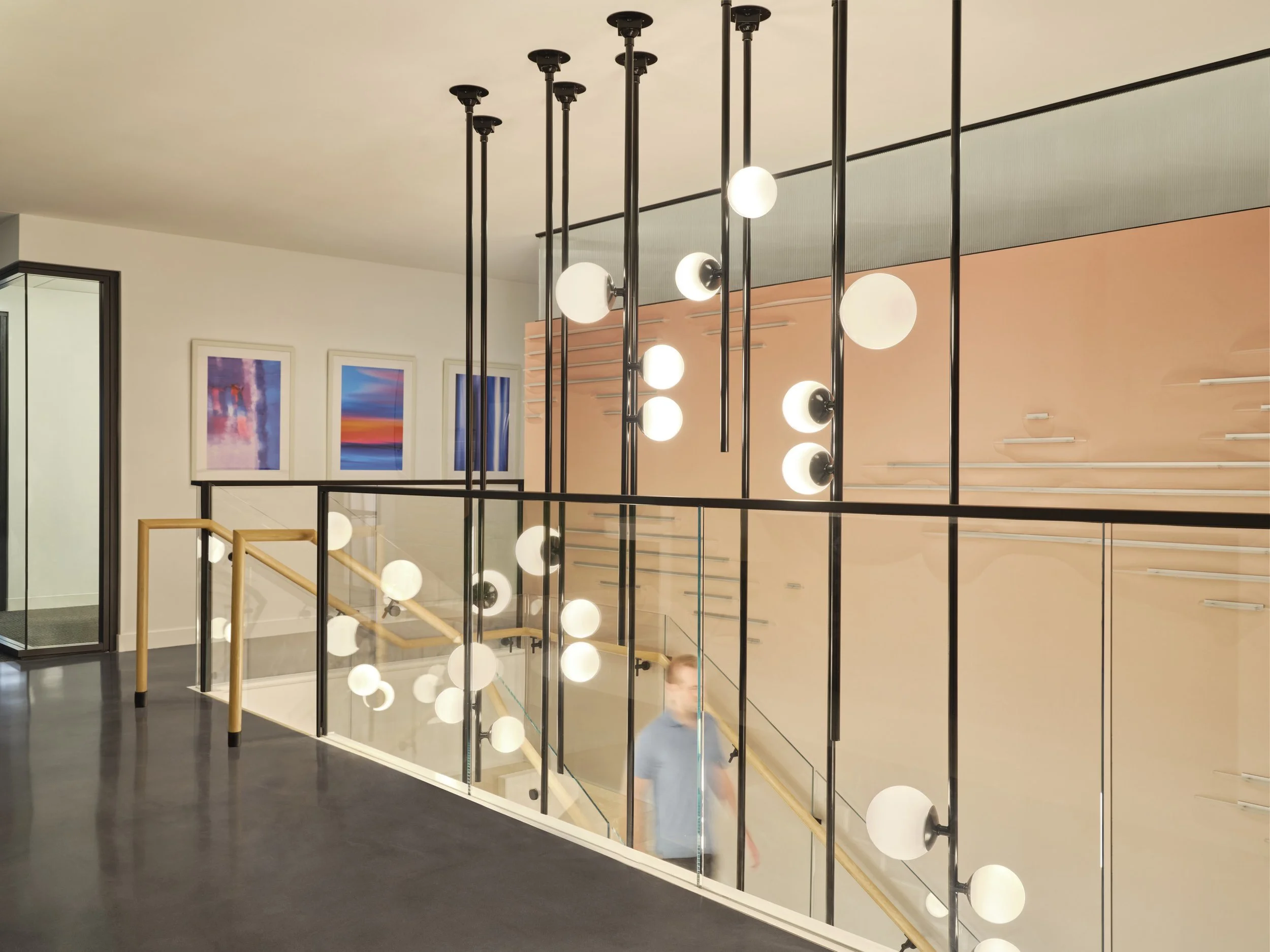 Stepped layers of fluid lines recall a mid-century modern flavor upon entering offices for this multinational firm. Simple forms of lines, curves, and spheres are used in the light fixture selections to complement a range of black, cream, and light wood finishes. Playful pendants over the café island and a grouping of spheres in the stairwell add variety. Elsewhere light coves highlight bold graphics in booths, simple downlights are hidden among whimsical acoustic baffles to provide ambient illumination, and sconces add decorative touches throughout.